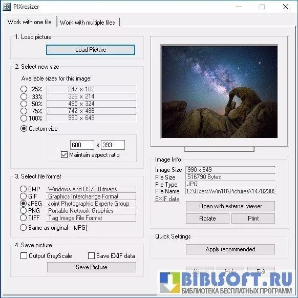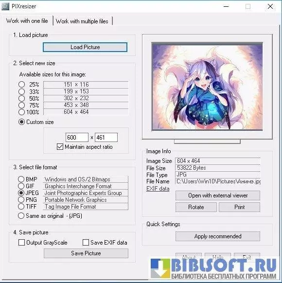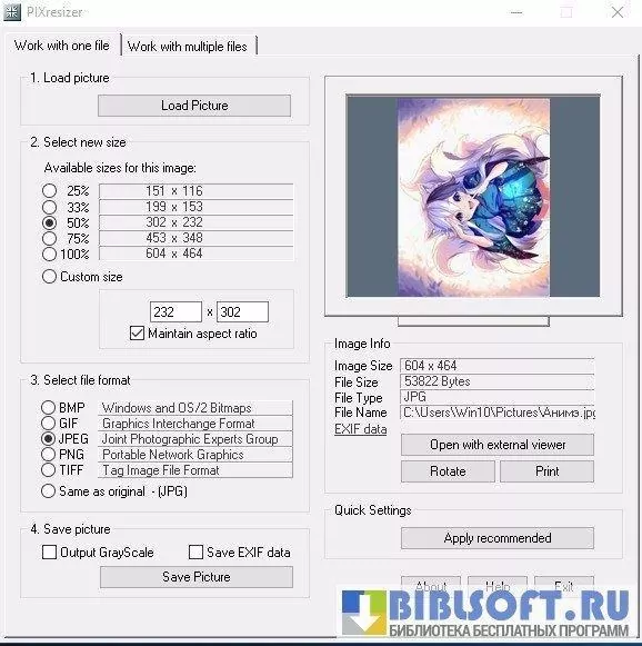 PIXresizer отлично справляется с преобразованием фотографий и цифровых иллюстраций без потери качества, давая возможность изменить формат или размер файла. Можно выбрать один файл или сразу несколько.