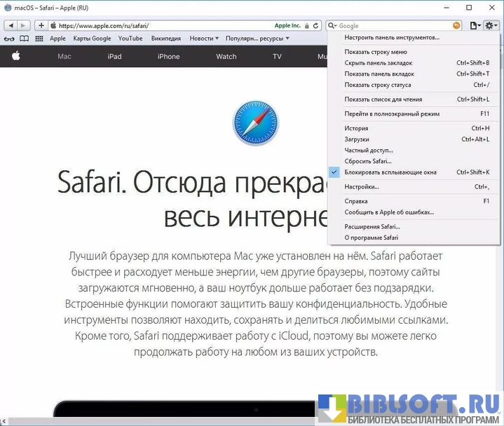 По умолчанию Safari использует блокировку всплывающих окон. Помимо этого браузер блокирует файлы cookie, позволяя пользователю беспрепятственно исследовать Интернет. Главные достоинства браузера – это: