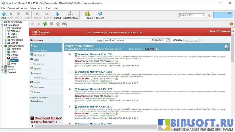 - Интегрированный поиск загрузок по категориям: приложений, музыки, игр, видео;