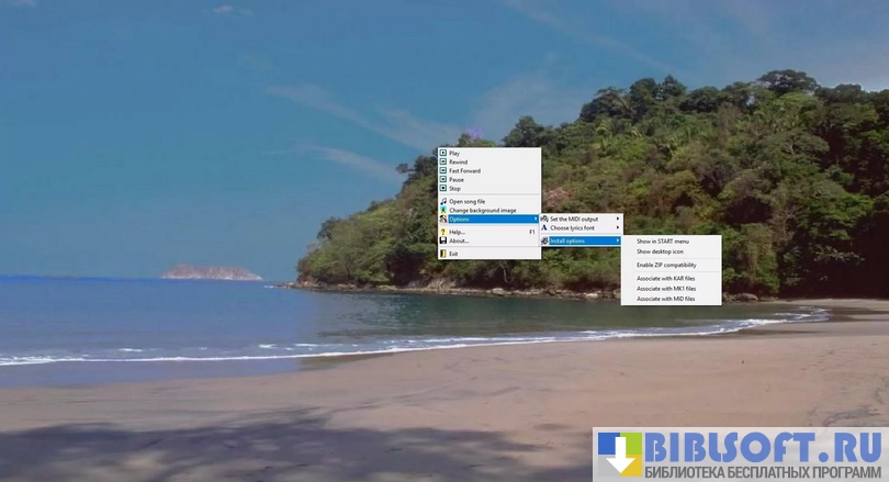 С помощью полноценного контекстного меню выбирайте фоновое изображение, выбирайте композиции, изменяйте параметры текста, регулируйте громкость с помощью настроек. Есть возможность использования горячих клавиш. С помощью кнопки клавиатуры «Вверх» открывается меню проигрывателя.