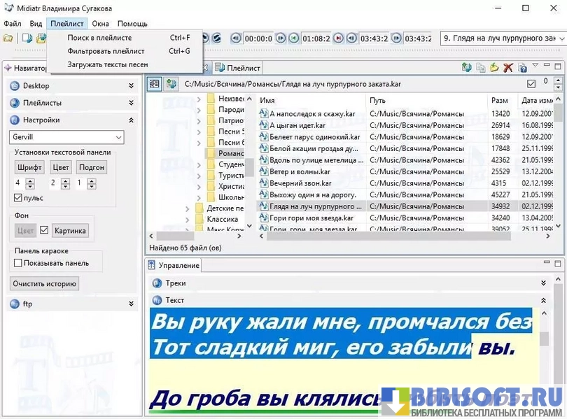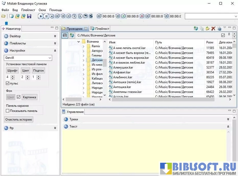 - Подгружает выбранные .mid- и .kar- файлы, интерпретирует их содержимое и цифровую структуру, отображает хранимыми ими данные в интерфейсе, с сохранением аутентичности цифровой архитектуры и форматирования;