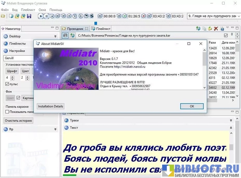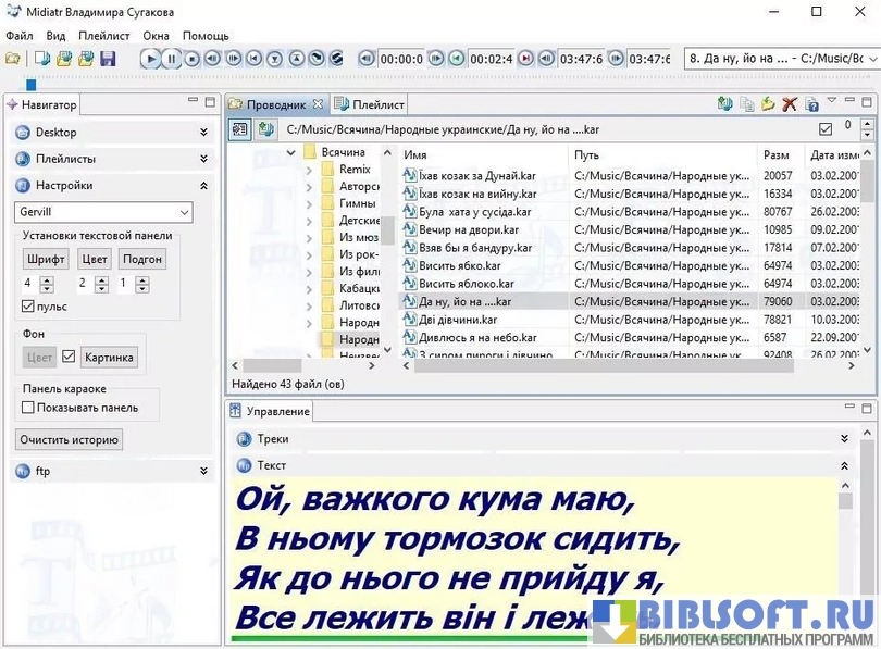 Midiatr – интерактивный караоке-редактор для Windows. Позволяет взаимодействовать с содержимым .mid- и .kar-файлов, в т.ч. – пакетно, в многопоточном режиме. Поддерживает возможность синхронизации с FTP-серверами.