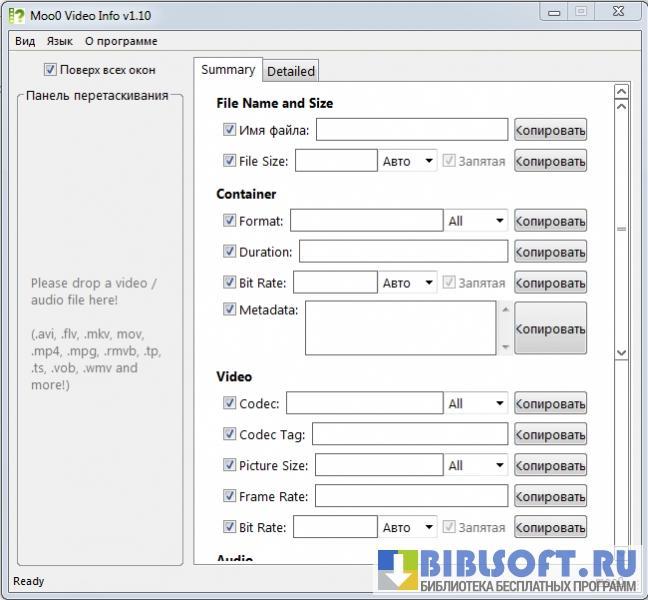 Moo0 Video Info – программа для просмотра подробных данных о видеофайлах и копирования информации в буфер обмена для использования в других программах.