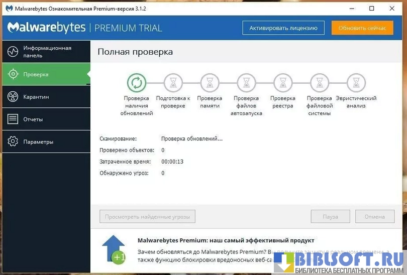 - режим ускоренного сканирования для удаления активных угроз. Можно запустить его в фоновом режиме и продолжить работу за компьютером, в то время как Malwarebytes Anti-Malware Free будет обнаруживать и удалять угрозы.
