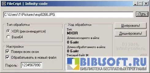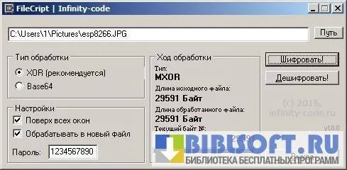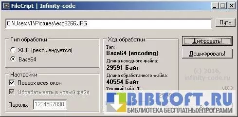 Предусмотрено 2 алгоритма шифрования - XOR и Base64. Все, что нужно сделать - указать путь к файлу, а затем в предназначенном для этого поле указать цифровой пароль. Теперь можно перейти к шифрованию, причем ход обработки данных вы можете наблюдать в режиме реального времени. Это все - файл готов к безопасному хранению на вашем ПК. Его можно отправлять по электронной почте или поделиться, воспользовавшись сервисами обмена данными. Для дешифровки нужно задать правильный путь к файлу, а затем ввести пароль.