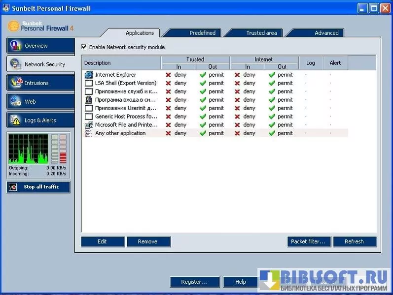 Sunbelt Personal Firewall – сетевой фильтр для Windows с несколькими предустановленными уровнями безопасности. Может использовать при работе как «стандартные», так и «произвольно-задаваемые» пользователем уровни безопасности.