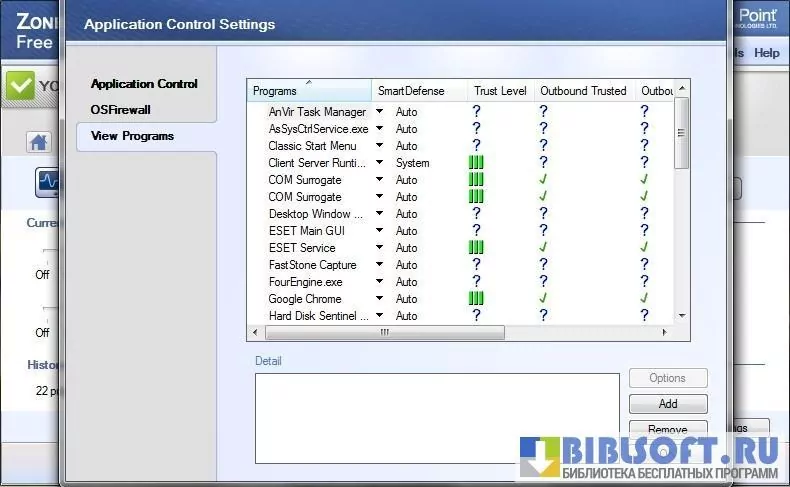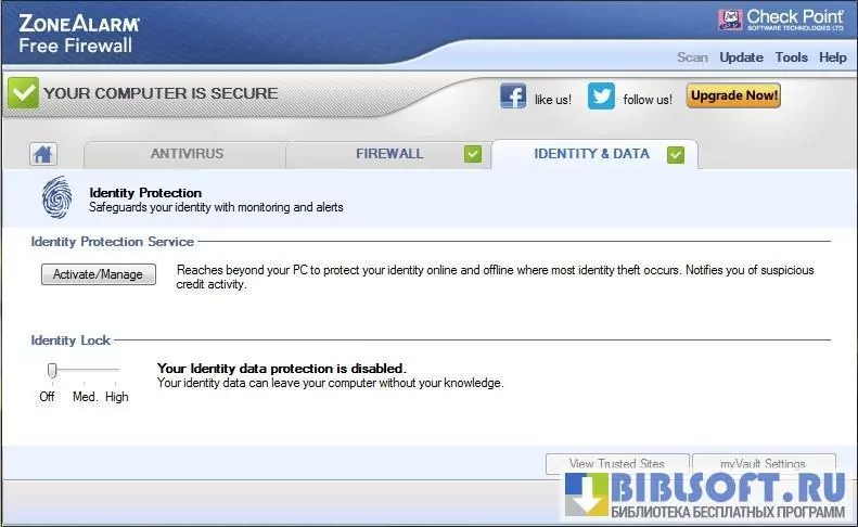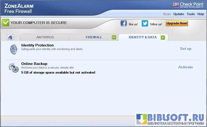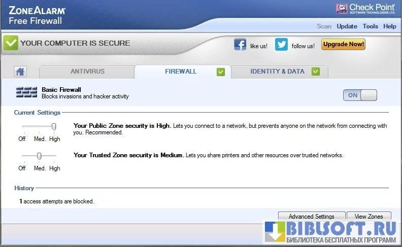 ZoneAlarm Free Firewall – многофункциональный брандмауэр для Windows. Объединяет в себе функциональную часть межсетевого экрана, утилиты для резервного копирования данных, сетевого анонимайзера и контроллера транзакций. Оснащен инструментами для сканирования и анализа сетевой активности используемых на ПК приложений.