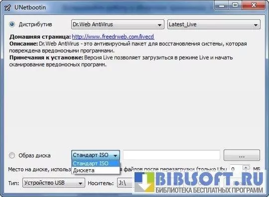 Утилита работает как с дисковыми накопителями, так и с ISO-образами. В последнем случае можно сделать загрузочную флешку отсутствующей в списке ОС. При выборе дистрибутива из списка утилита предоставляет ссылку на его домашнюю страницу, где пользователь может почерпнуть больше информации и принять решение о необходимости его установки. Возможна закачка дистрибутива, если он отсутствует на компьютере или дисковом носителе. UNetbootin не требует инсталляции на HDD компьютера и работает в portable-режиме.