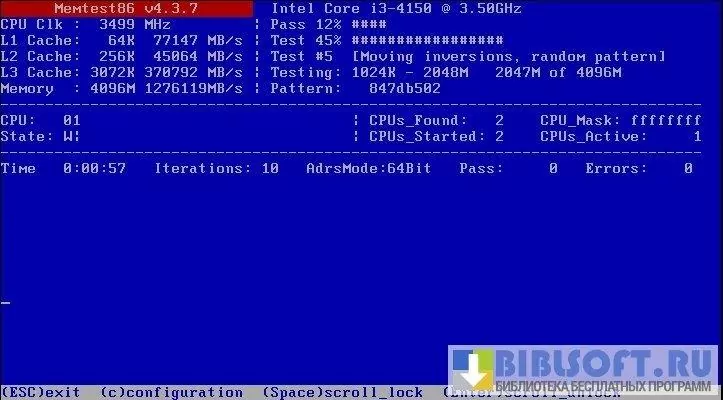 При правильном выполнении всех действий загрузится окно приложения (синего цвета). Дальнейшая проверка ОЗУ начнется автоматически. Если Memtest86+ удастся обнаружить испорченные сектора, то все они будут подсвечены красным цветом.