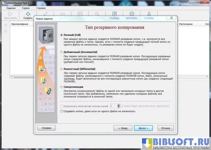 Exiland Backup Free – сервисная утилита для Windows, создающая бэкапы файлов и папок. Имеет несколько автоматических режимов работы – полное копирование (Full), копирование добавленных файлов (Incremental), копирование отличающихся файлов (Differential) и синхронизация всего содержимого папок.