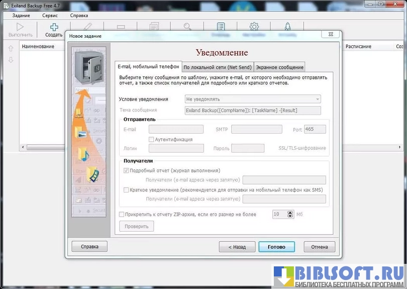 - Информирует пользователя о необходимости сделать бэкап, в случае наступления указанных в расписании времени/даты, через интерфейс, телефон, e-mail и т.д.
