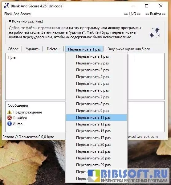 - выбор пользователем количества циклов перезаписи нулями освободившегося дискового пространства (от 1 до 32).