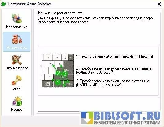 Главная функция программы Arum Switcher состоит в изменении текста, который по ошибке был напечатан в неправильной раскладке. Поддерживается исправление последней строки или выделенного текста. Для этого достаточно использовать определенную заранее комбинацию клавиш. Это же касается и изменения регистра букв.