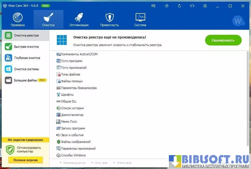- Сканирует систему, выявляет ошибки реестра, фрагментированные блоки данных на подключенных информационных носителях и цифровой мусор в темп-директориях системы;