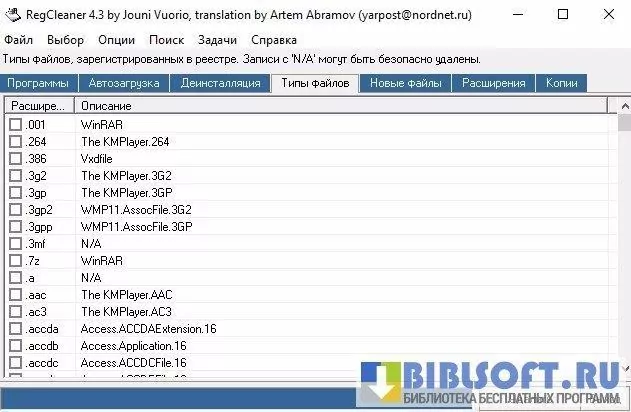 Утилита RegCleaner проводит сканирование реестра на наличие данных об удаленных файловых ассоциациях и программном обеспечении. Можно провести полный или частичный анализ пространства на диске с выдачей результата о расположении, типе и возрасте файлов.